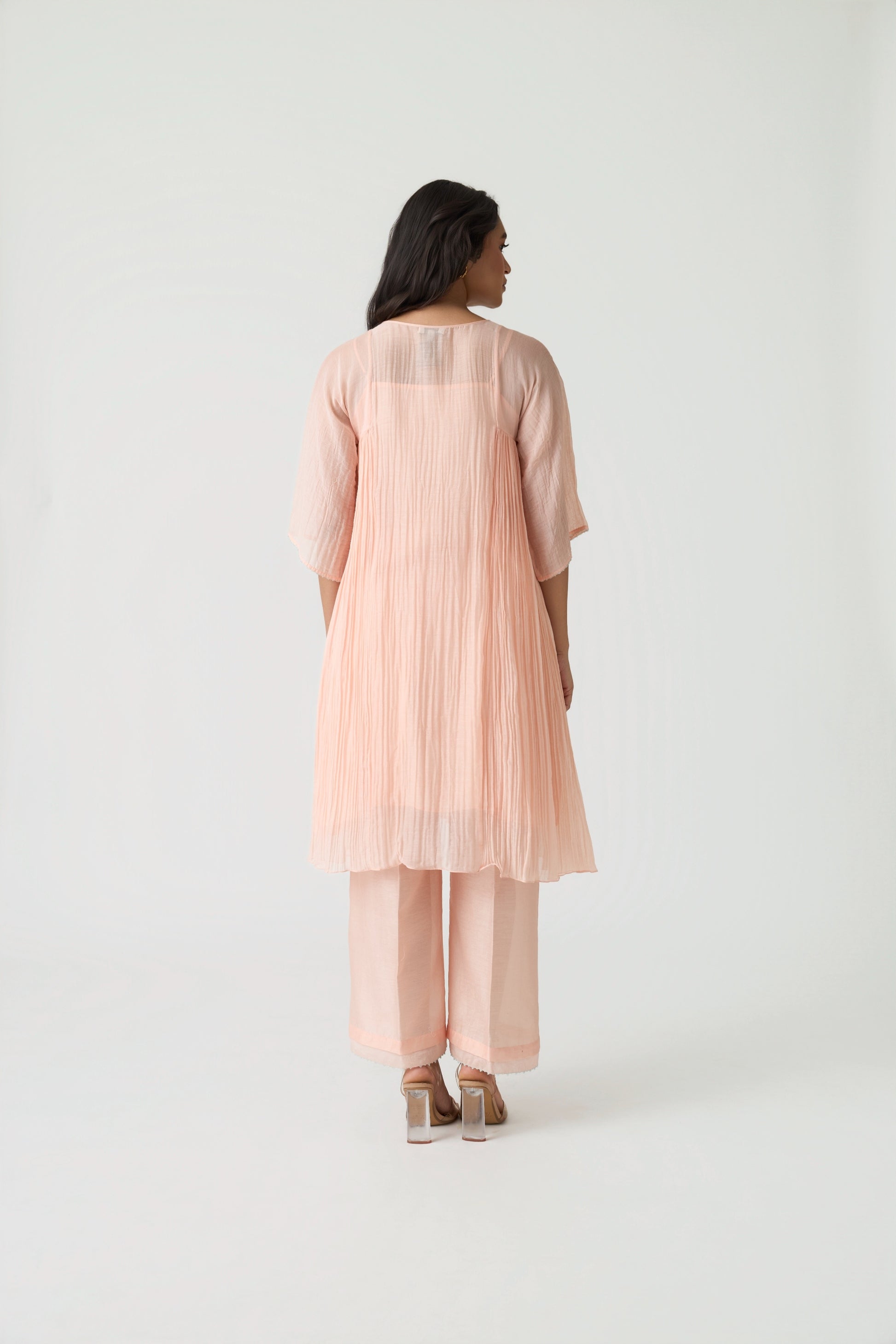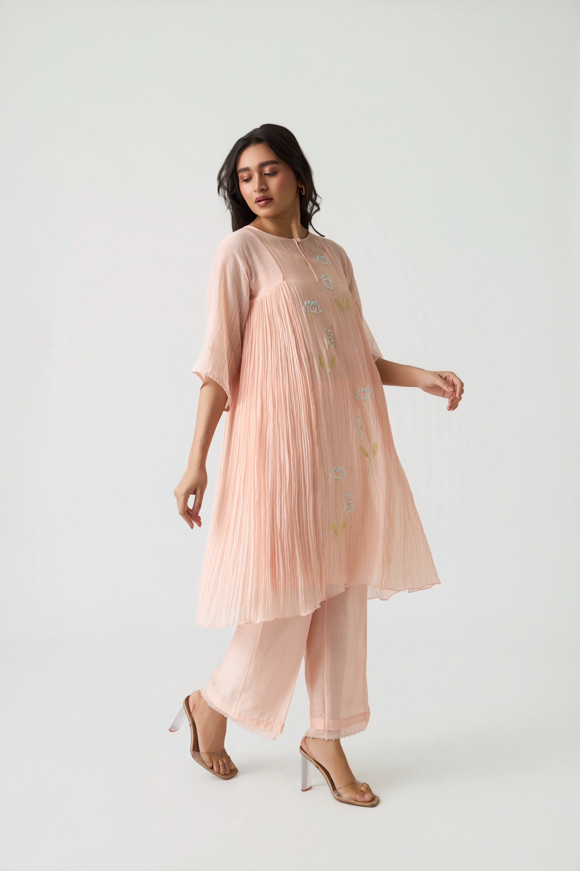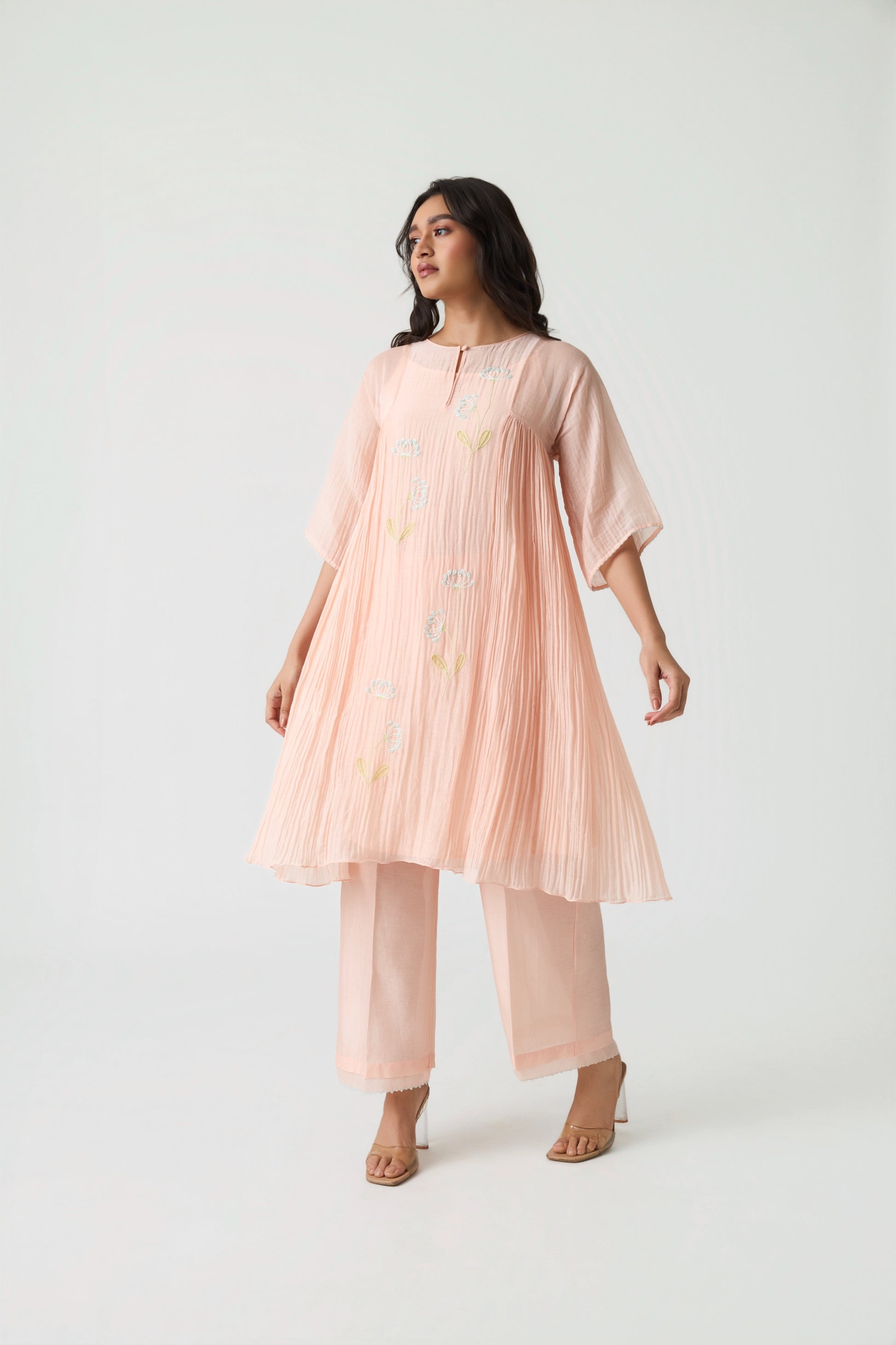 Experience effortless elegance with our Aita Peach Co-ord Set, crafted in a soothing sunset-peach palette. The tunic is designed in a translucent natural Maheshwari silk fabric and beautifully adorned with fine hand-embroidered applique work on the front panel. Delicate bead detailing adds a refined touch to the ensemble.