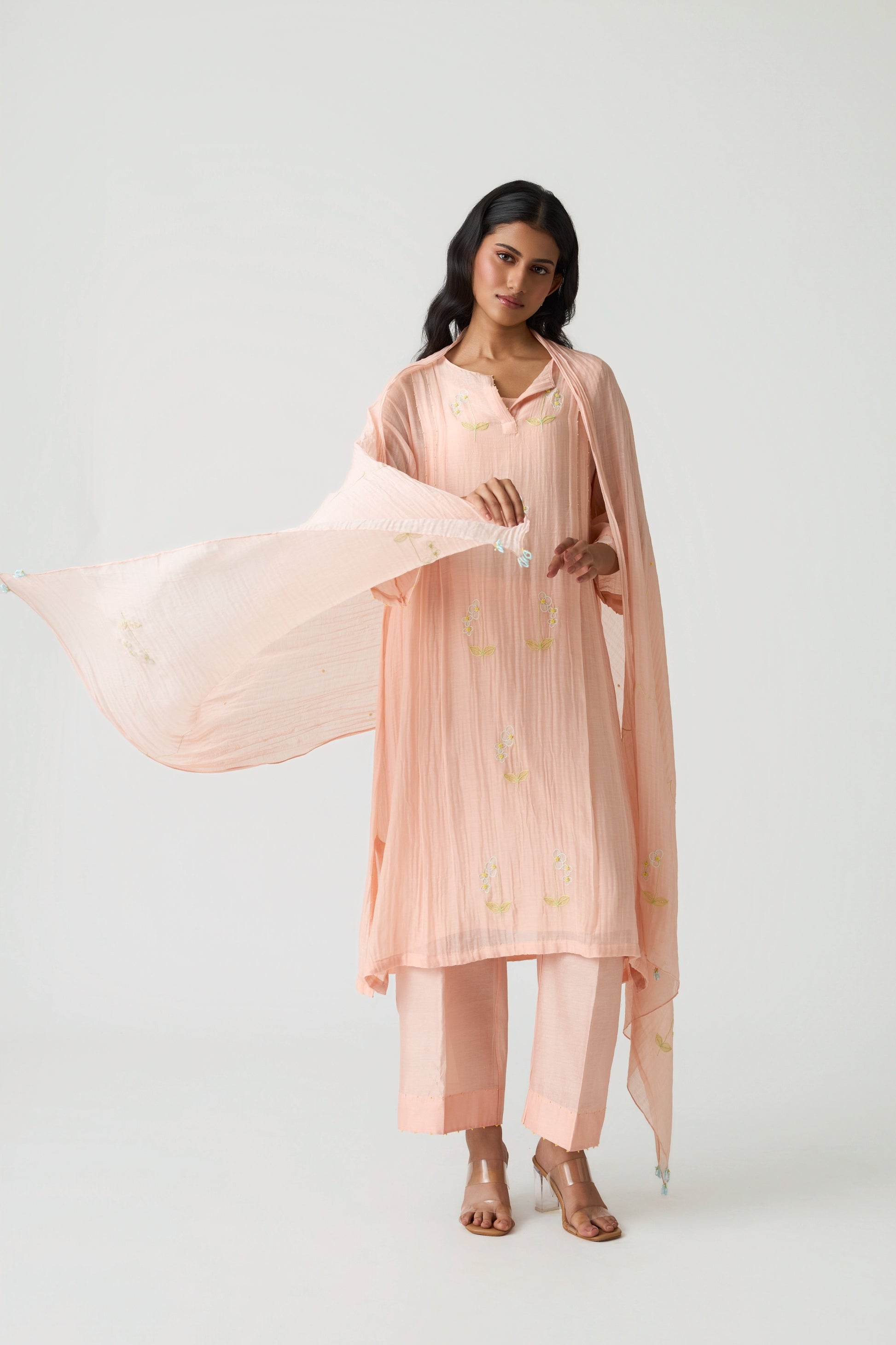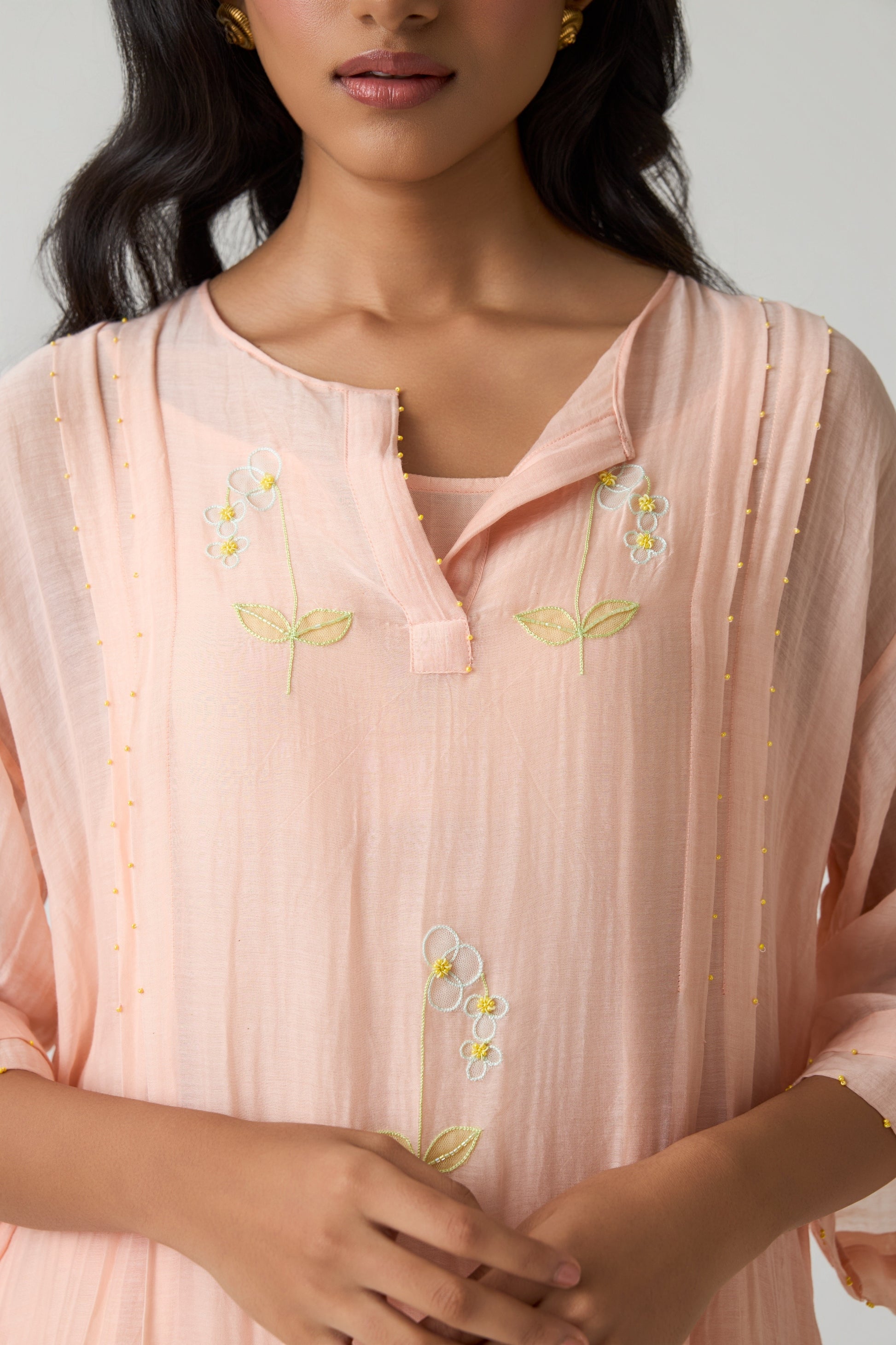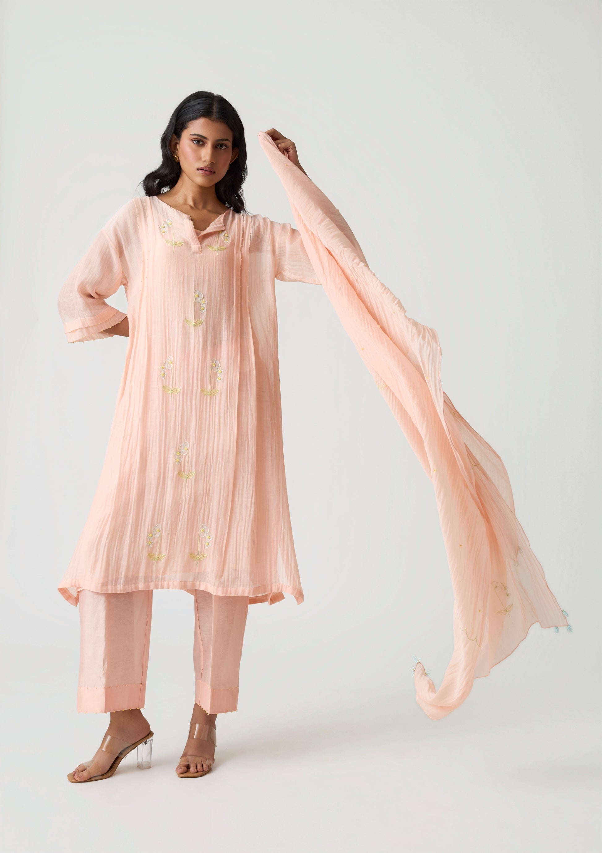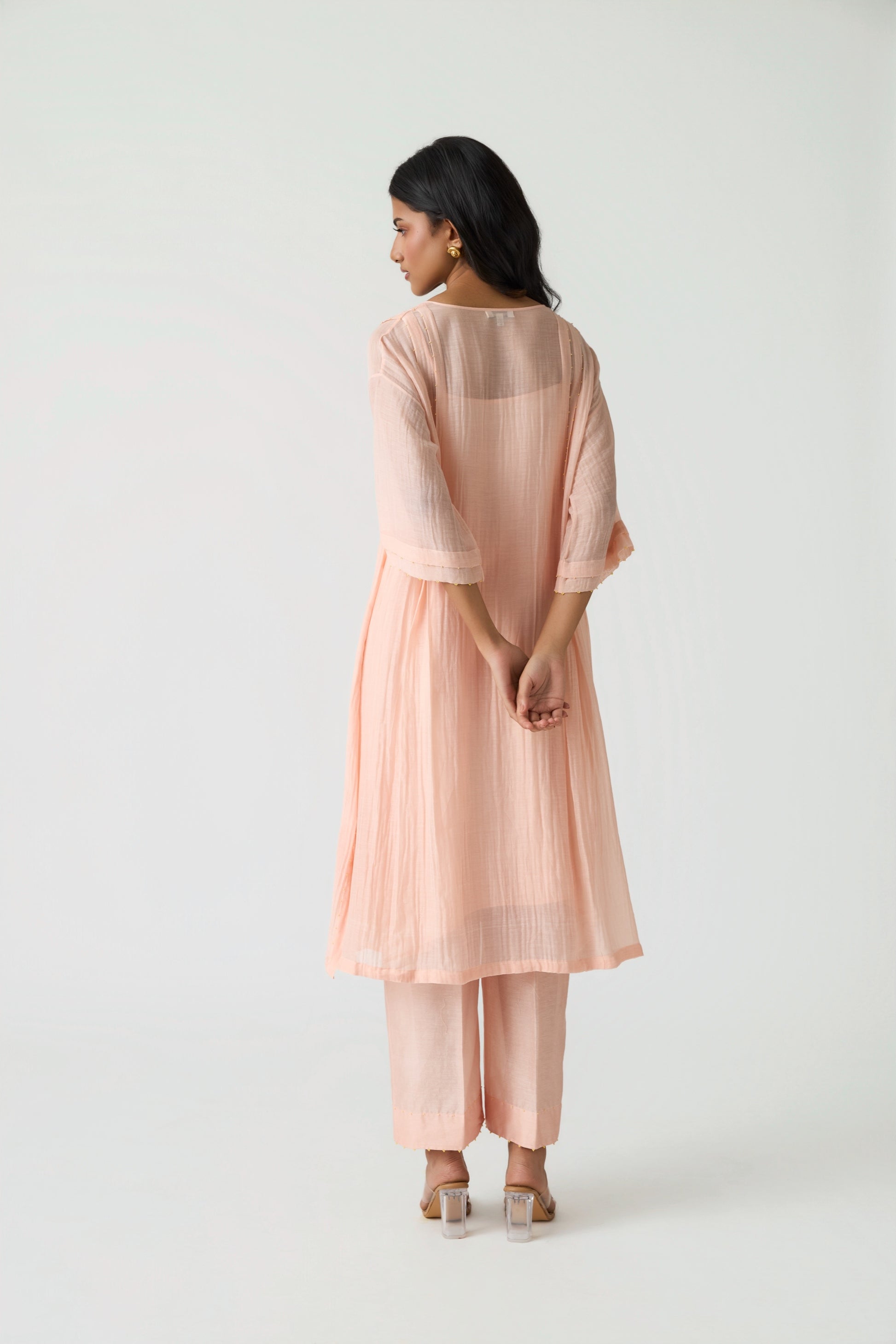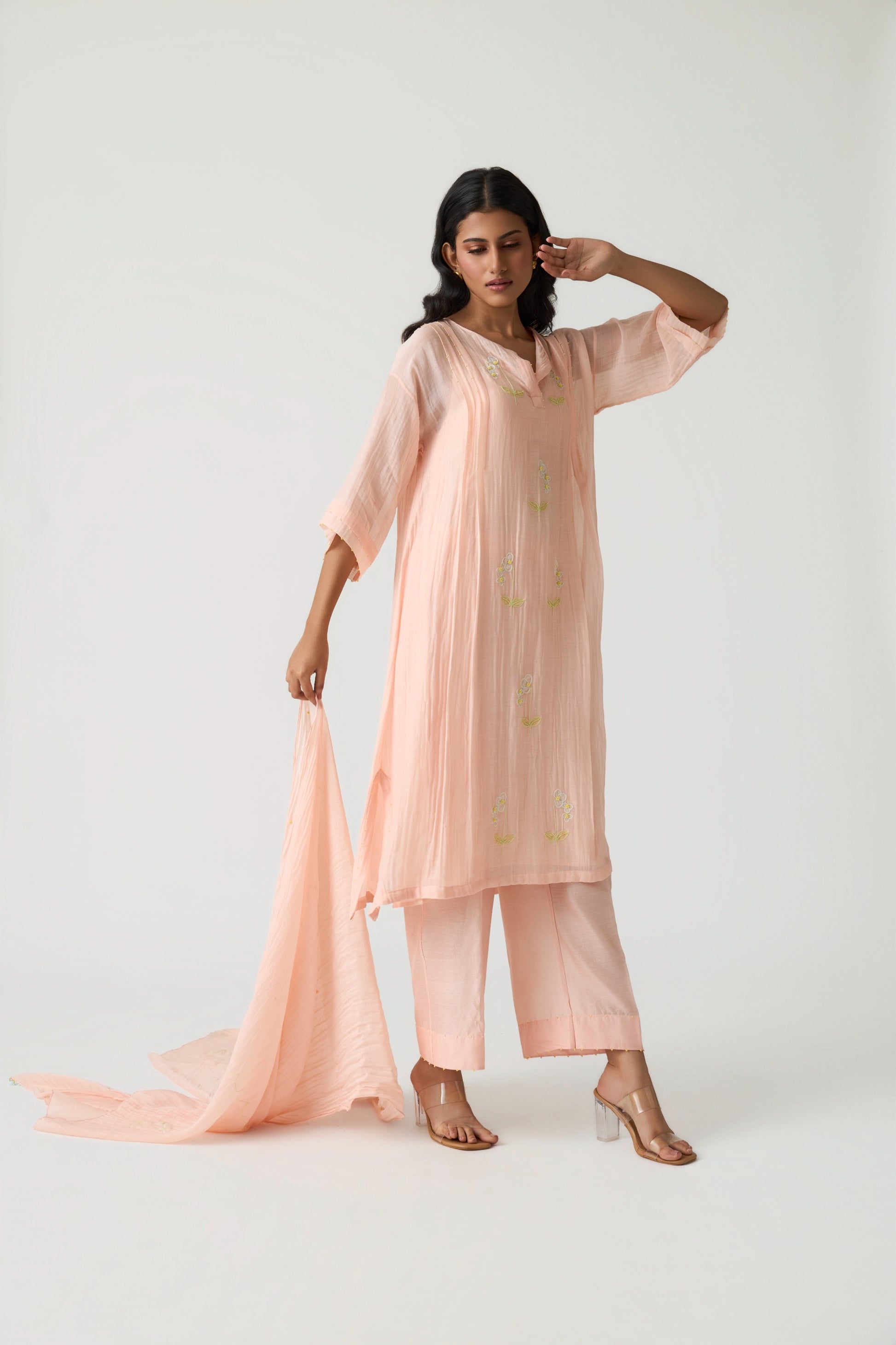 A beautifully crafted ensemble designed for effortless comfort and elegance. The tunic features a refined two-pleat pattern that enhances ease of movement, showcased in a soothing Sunset Peach hue. Subtle contrast appliqué work adds a touch of artistry to the minimal yet graceful silhouette.