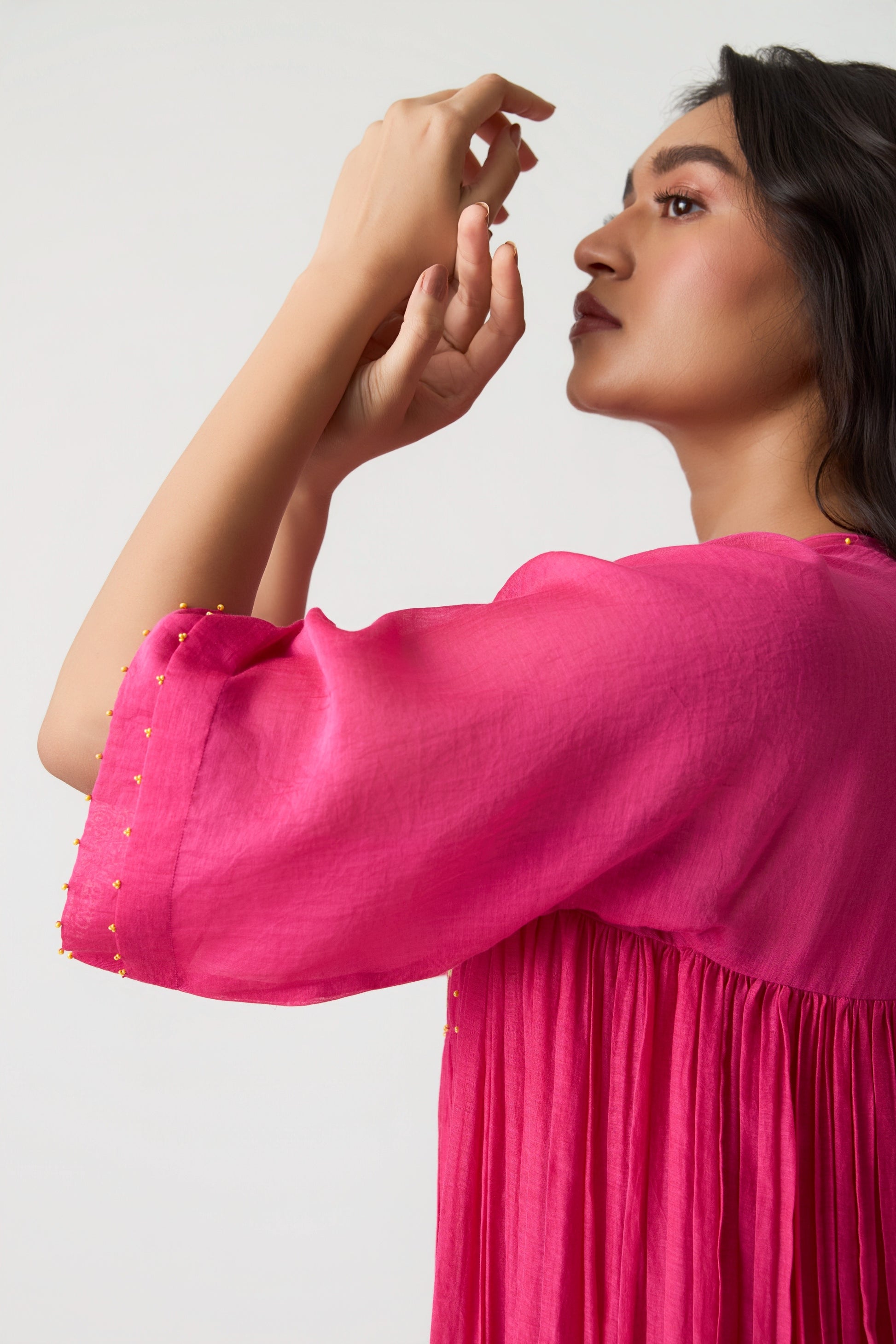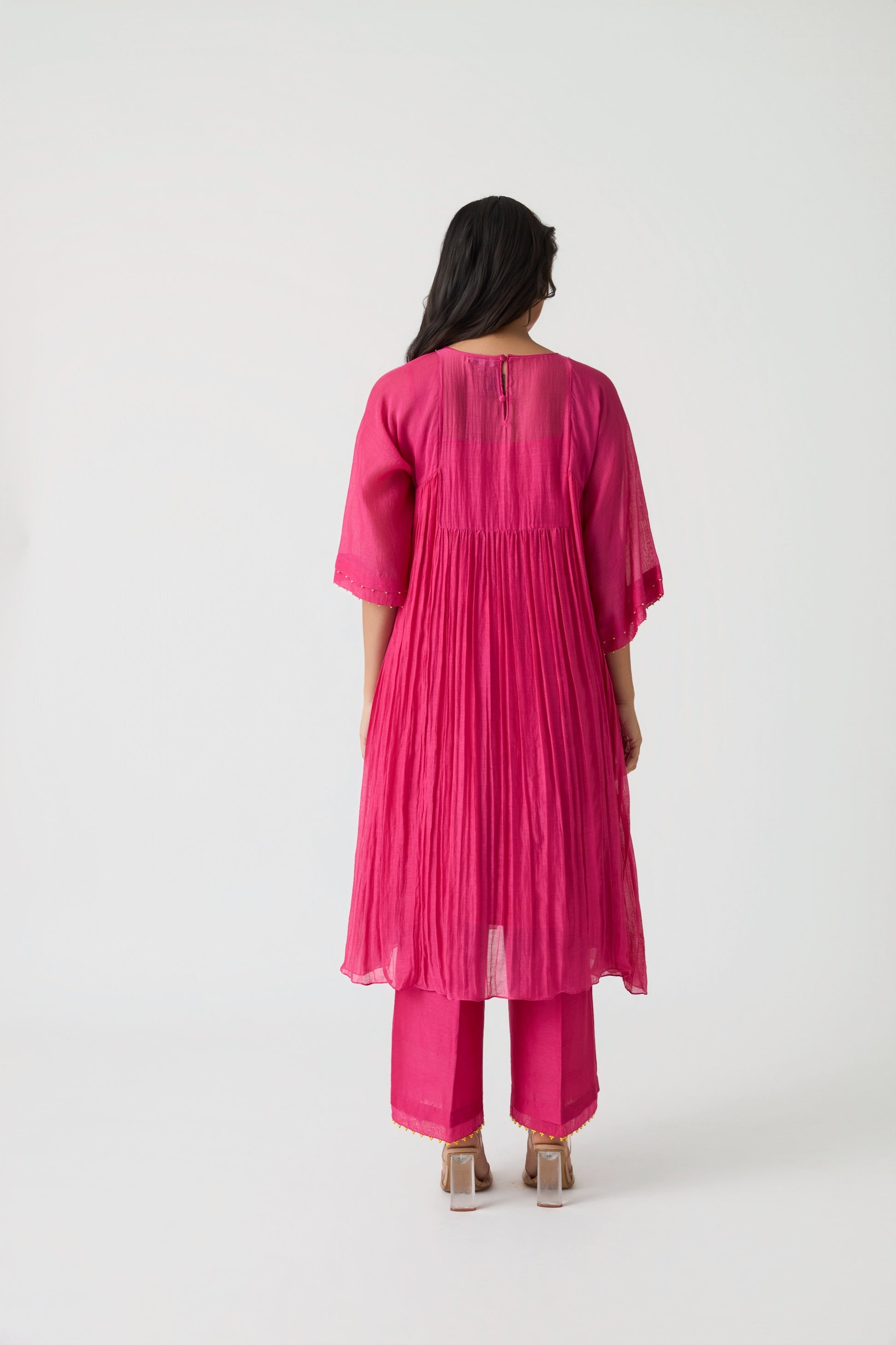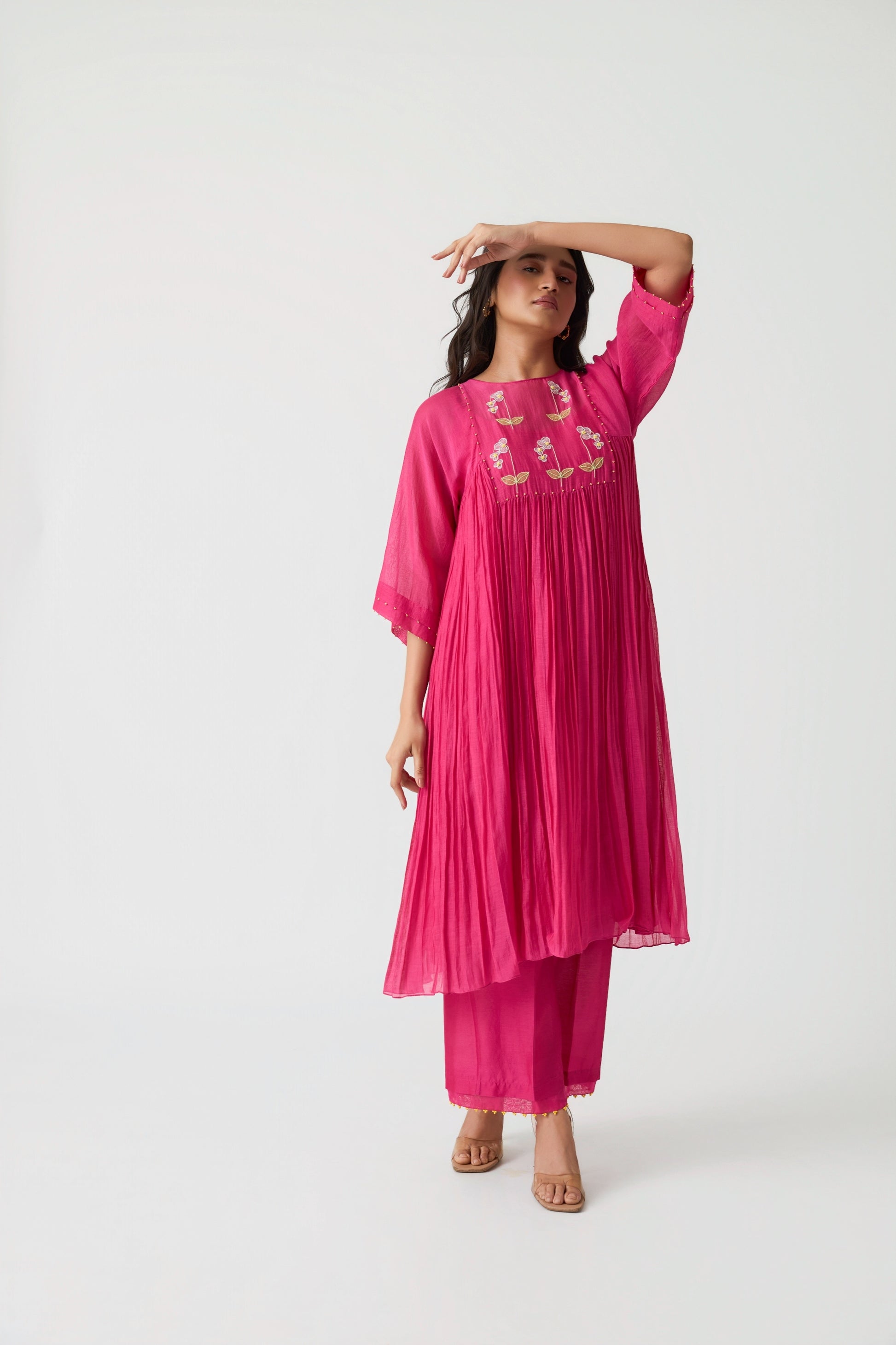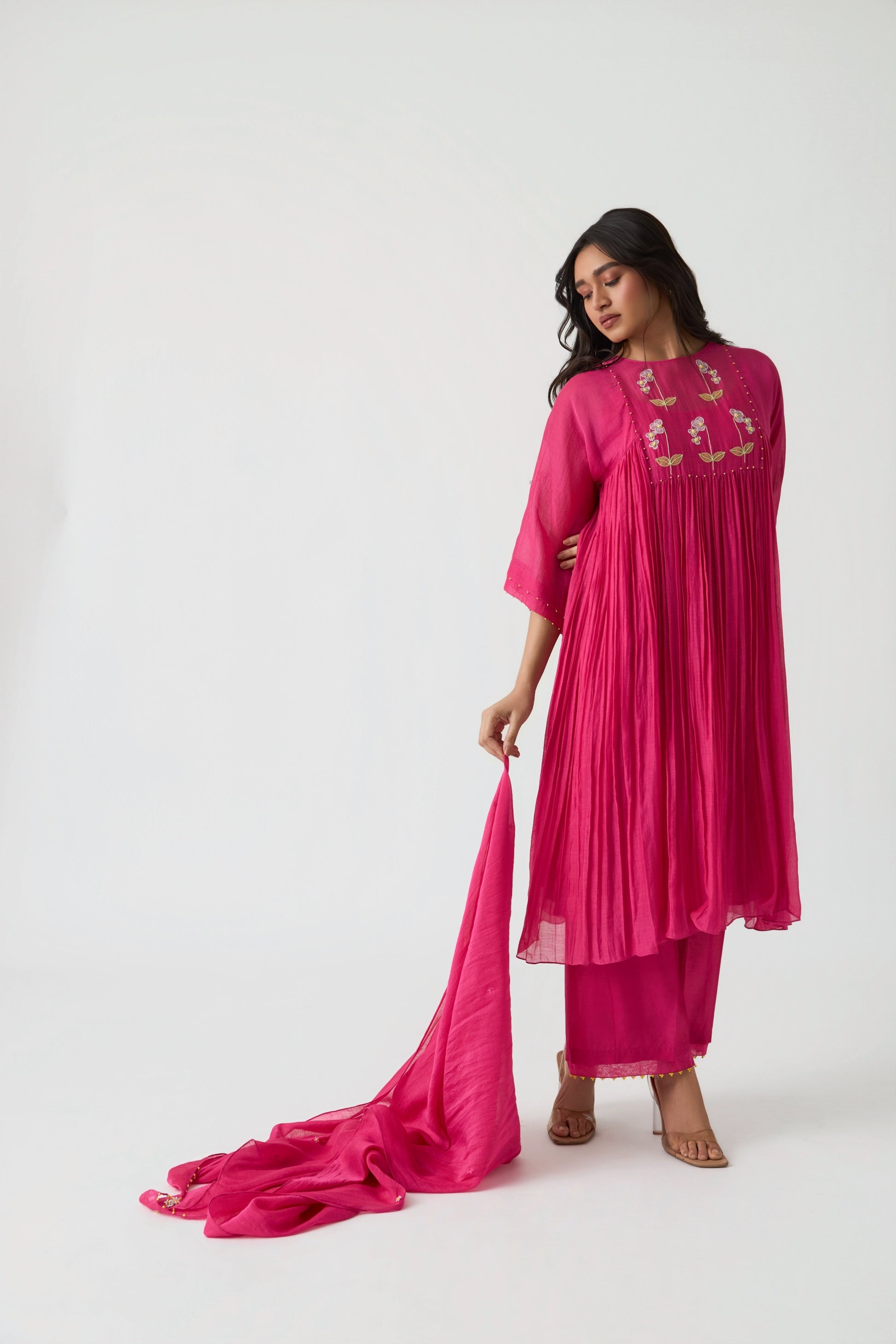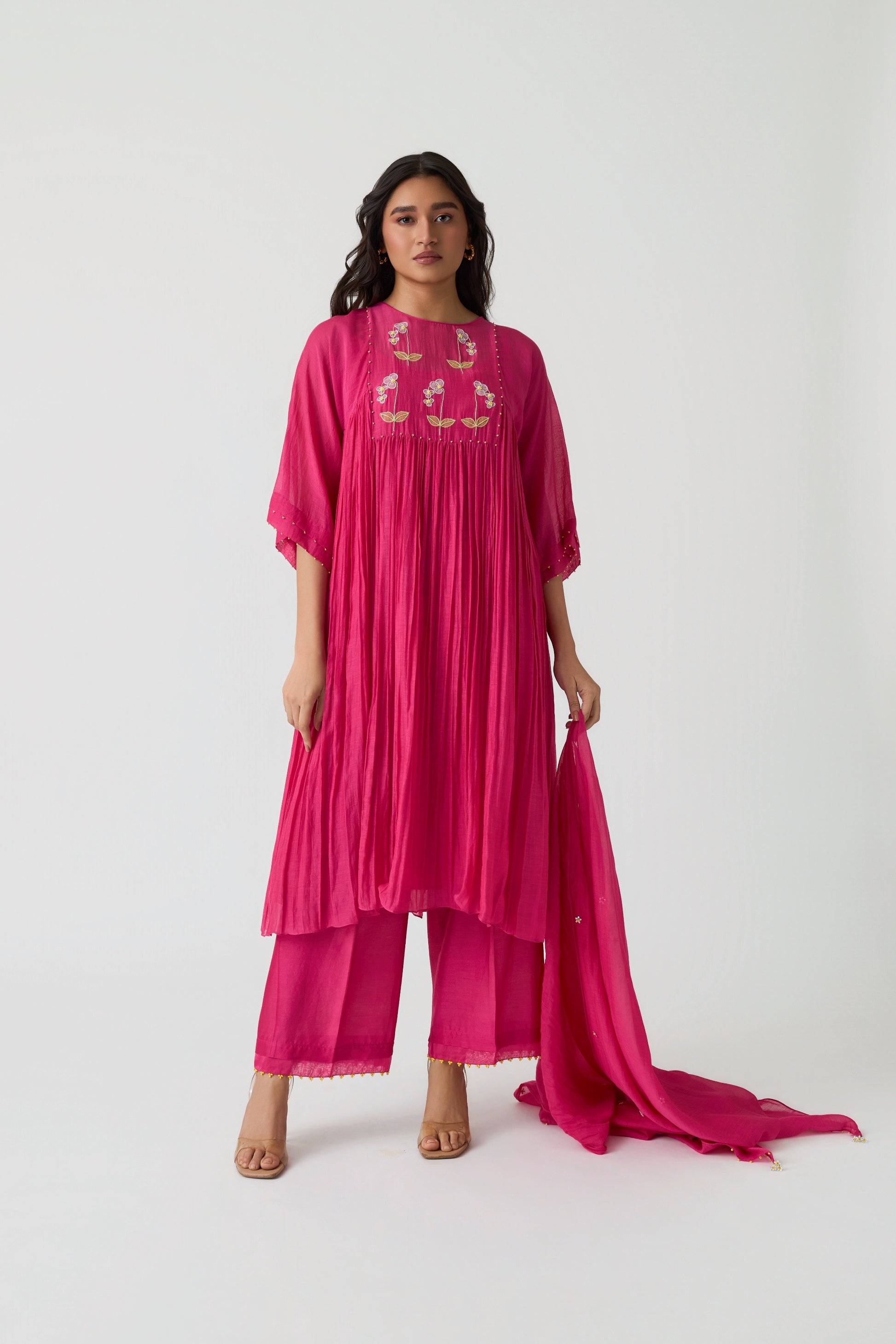 A beautifully crafted ensemble featuring delicate embroidery and airy, lightweight fabric in a soft Hibiscus Pink hue. The tunic is tailored in premium Maheshwari fabric, paired with elegant Chanderi silk pants and a luxurious Maheshwari silk dupatta, creating a refined and graceful look for any occasion.